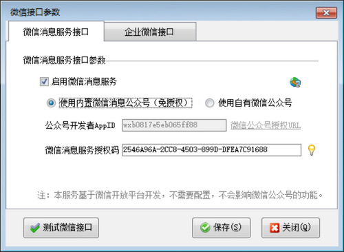 在功能導(dǎo)航窗點(diǎn)擊“擴(kuò)展應(yīng)用”,打開“微信接口參數(shù)”進(jìn)行配置。支持內(nèi)置微信消息公眾號和自有微信公眾號發(fā)送兩種方式,如下圖所示: