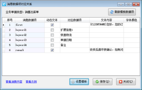 功能導(dǎo)航窗點(diǎn)擊“系統(tǒng)管理”—》“單據(jù)業(yè)務(wù)參數(shù)”,選擇“微信消息參數(shù)設(shè)置”,選擇相應(yīng)的業(yè)務(wù)單據(jù),工具欄點(diǎn)擊“設(shè)置參數(shù)”,可設(shè)置發(fā)送時(shí)間點(diǎn)和接收對象,選擇微信消息模板(微信公眾號需提前申請好模板配置),微信消息模板選擇后需對應(yīng)軟件中的數(shù)據(jù)項(xiàng),如下圖所示: