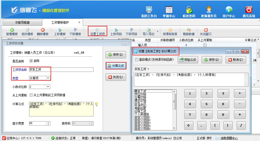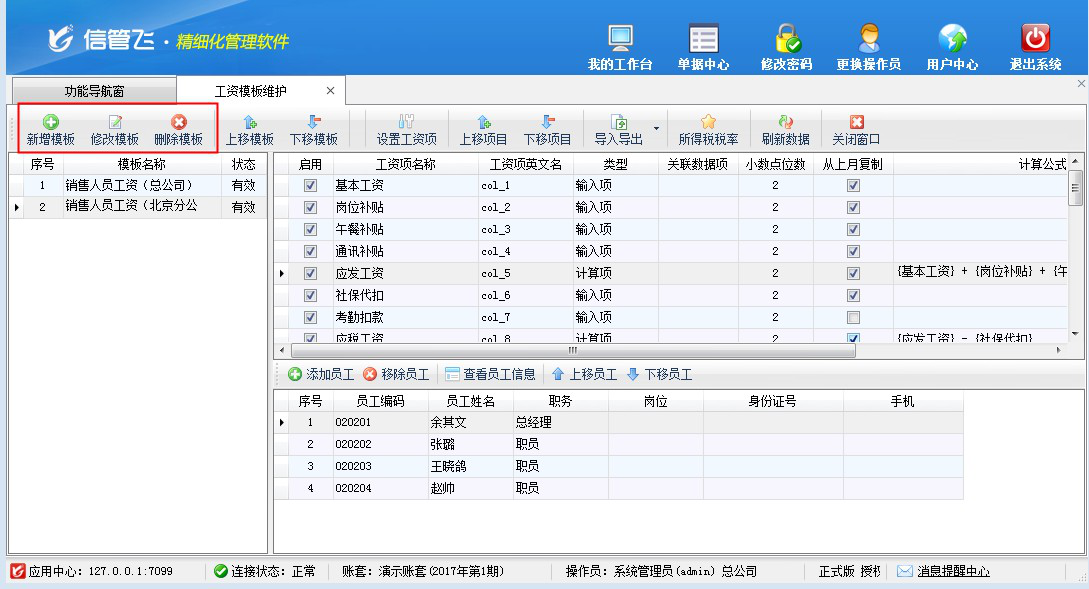 工資模板維護(可以新增多個工資模板,支持自定義工資項和自定義工資計算公式)