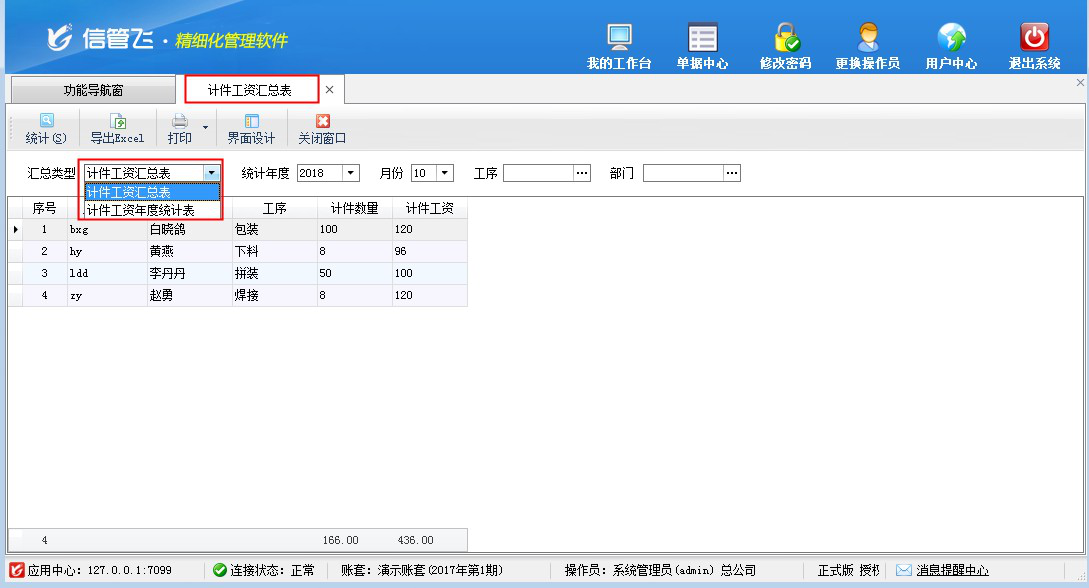 工資匯總統計和計件工資匯總表中可按年度和部門進行匯總工資記錄