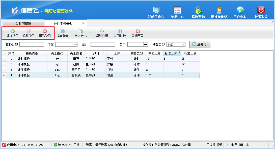 計件工資管理,可以快速錄入計件模板內容或直接新增員工計件工資