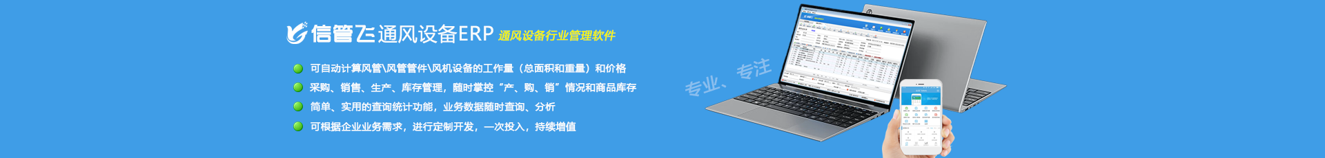 信管飛通風設備ERP軟件是一款針對通風設備行業開發的進銷存ERP記賬軟件(風管風機銷售軟件、暖通ERP管理軟件、暖通業務管理系統、風管設備報價軟件、風管面積計算軟件),系統主要包括采購管理、銷售管理、庫存管理、往來賬管理、出納管理等業務管理功能,并支持財務管理、簡易生產加工管理、智能Excel導入等數十個擴展功能模塊(需單獨付費)。本系統結合通風設備行業特點,實現可定制的數據計算模型,可自動計算風管展開面積、生成銷售價等信息,支持風管庫、風機庫維護管理,以訂單為主線流程,串聯銷售出貨、生產加工、庫存管理,輕松實現通風設備業務管理信息化!