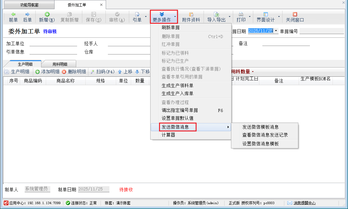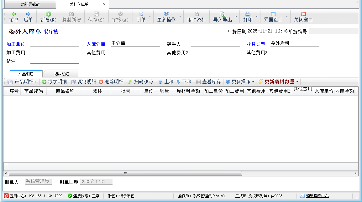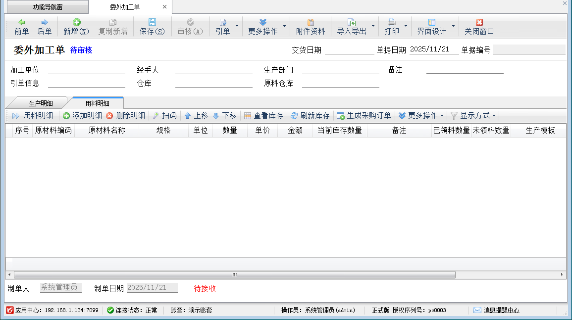 引單:委外領(lǐng)料單可以引用“委外加工單”,并將加工單中的產(chǎn)品明細(xì)作為單據(jù)的生產(chǎn)明細(xì),同時(shí)如果相應(yīng)的商品有生產(chǎn)模板則自動(dòng)根據(jù)生產(chǎn)模板生成領(lǐng)料明細(xì)。