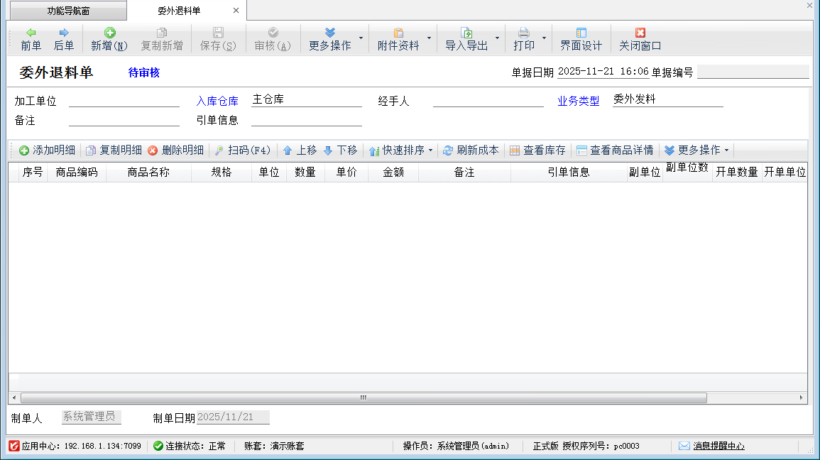 ????在生產(chǎn)過(guò)程中,如果出現(xiàn)多領(lǐng)料或取消委外任務(wù)的情況下,有可能需要開(kāi)委外退料單進(jìn)行退料操作。