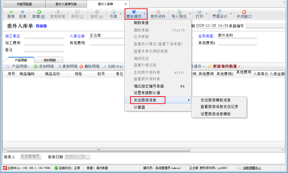 發(fā)送微信消息:點(diǎn)擊“更多操作”—》“發(fā)送微信消息”按鈕,可以進(jìn)行發(fā)送微信模板消息,查看微信消息發(fā)送記錄,設(shè)置微信消息模板等操作。(其中具體操作詳見(jiàn)銷(xiāo)售訂單3.3.1)。