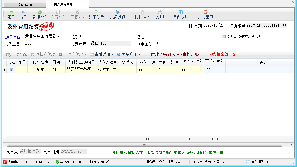 ????委外費(fèi)用結(jié)算單的操作方法可參見(jiàn)付款結(jié)算單功能。