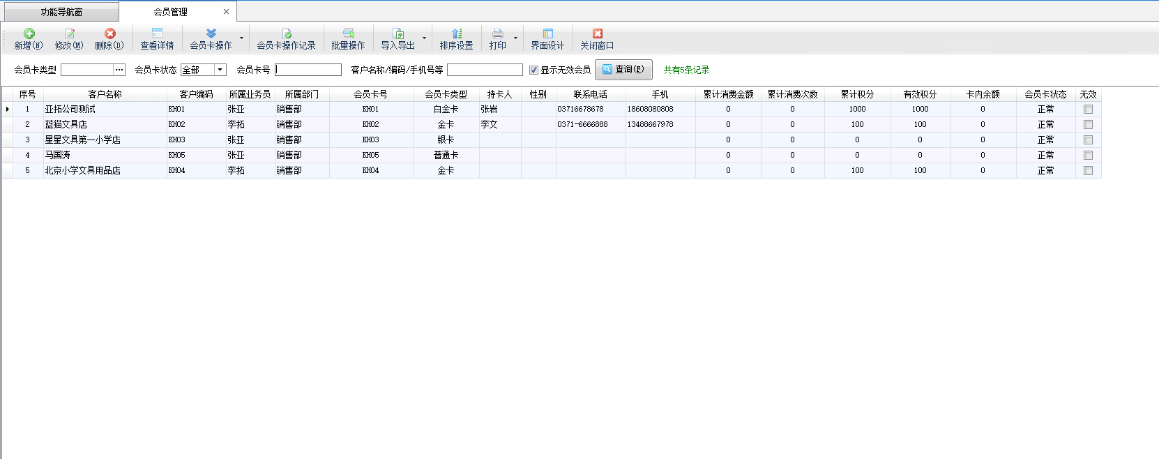 ????在功能導航窗點擊“會員管理”—》“會員管理”即可進入會員管理界面,其界面如下圖所示。