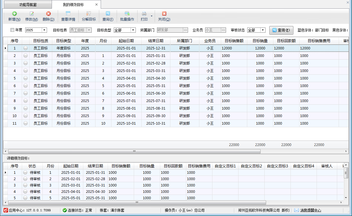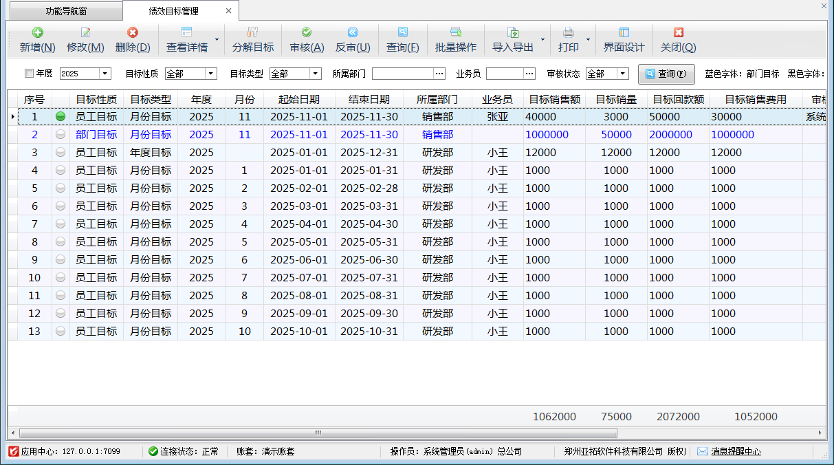 查詢:可以根據(jù)年度、目標(biāo)性質(zhì)、目標(biāo)類型、部門、業(yè)務(wù)員及審核狀態(tài)等條件查詢績效目標(biāo)記錄。