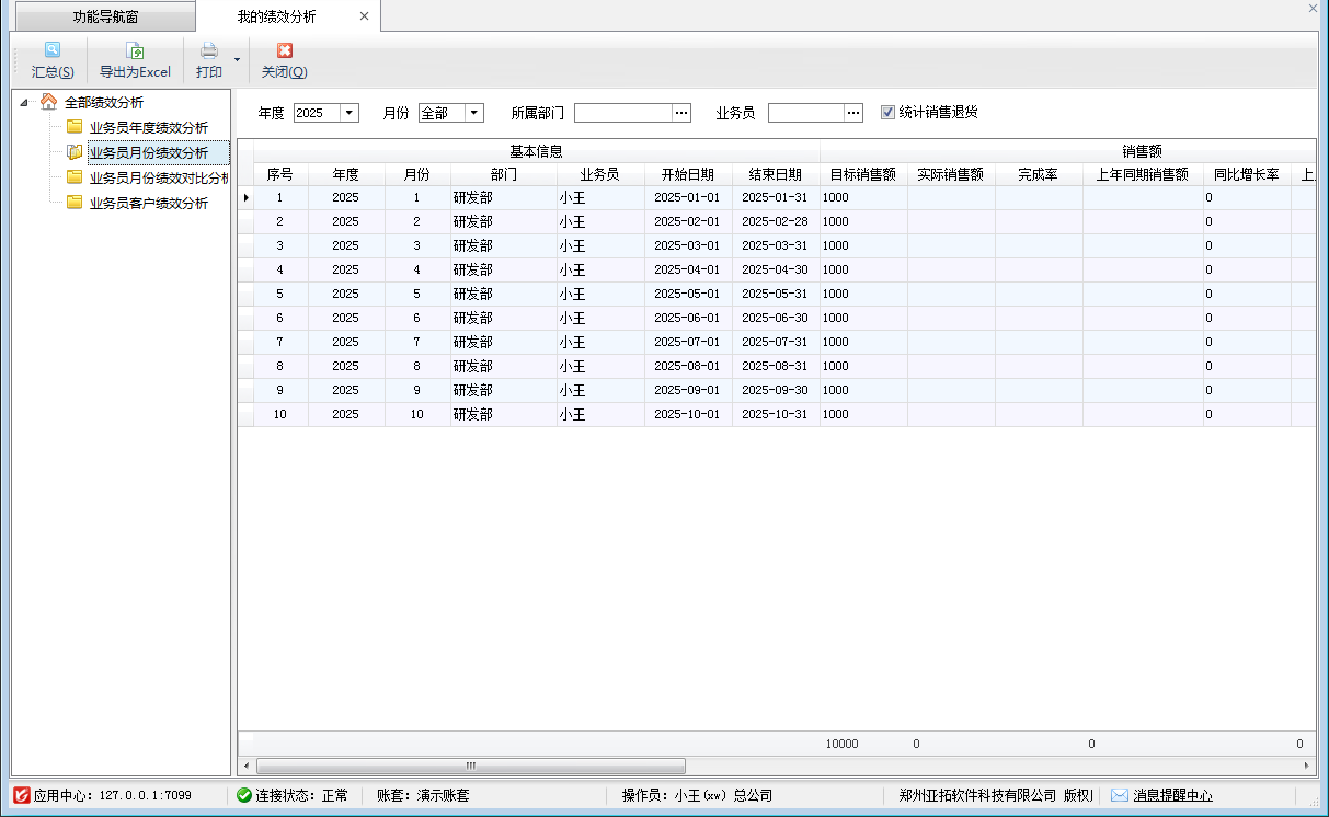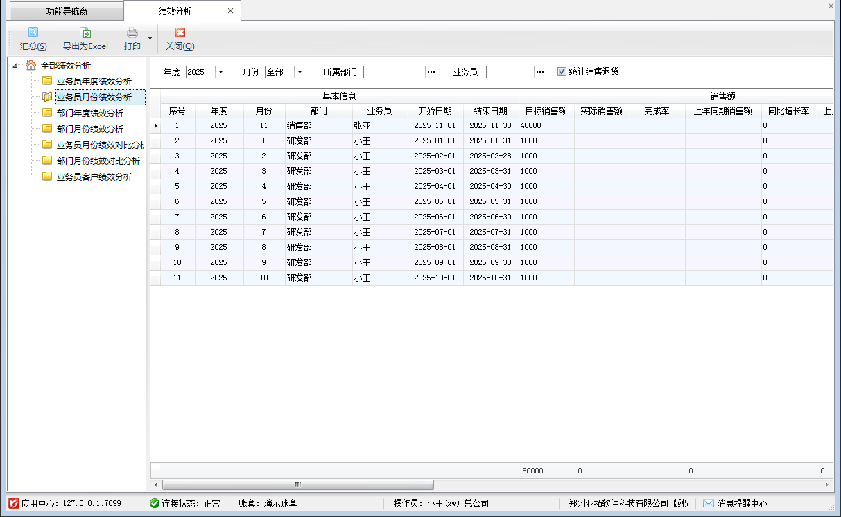 ????在功能導(dǎo)航窗點擊“績效考核”——“我的績效分析”,即可進入到我的績效分析界面,包含業(yè)務(wù)員年度績效分析、業(yè)務(wù)員月份績效分析、業(yè)務(wù)員月份績效對比分析、業(yè)務(wù)員客戶績效分析等,其界面如下圖所示。