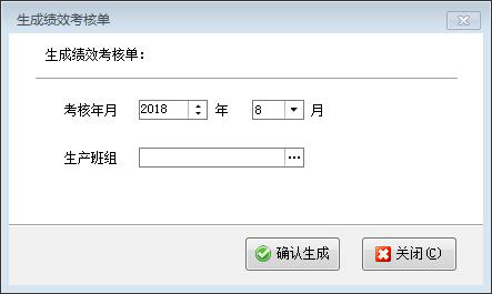 生成績效考核單:點擊“生成考核單”按鈕,可以彈出生成績效考核單窗口,在此窗口可以選擇年度、月份及相應(yīng)的生產(chǎn)班組,然后點擊“確認生成”按鈕即可生成相應(yīng)的績效考核單,如圖所示: