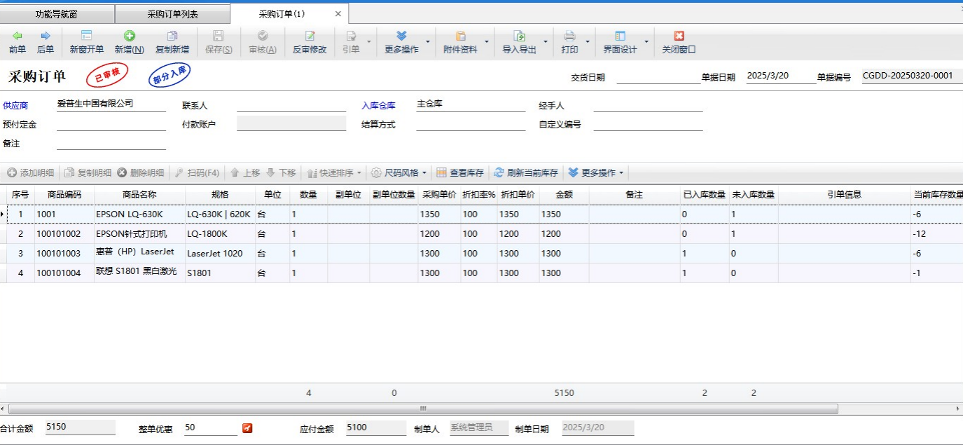 ????采購訂單即采購訂貨意向,采購訂單不影響庫存。采購訂單并非必須使用的功能,如果使用采購訂單功能,可以開“采購入庫單”時,引用(即調取)采購訂單,保存并審核采購入庫單后,軟件會自動更新相應采購訂單中商品明細的已完成(即已收貨)數量和采購訂單的執行狀態。