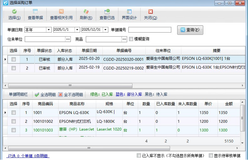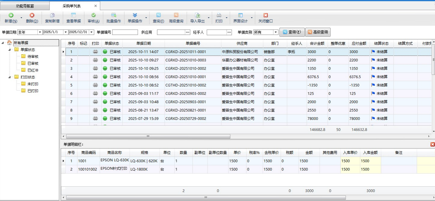 查詢:可以根據單據日期、打印狀態、供應商、商品名稱等條件查詢業務單據。