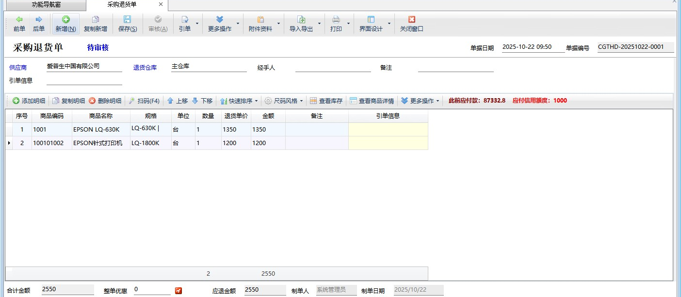 新增采購退貨單:在工具欄點擊“新增”—“采購退貨單”即可打開新增采購退貨單界面。