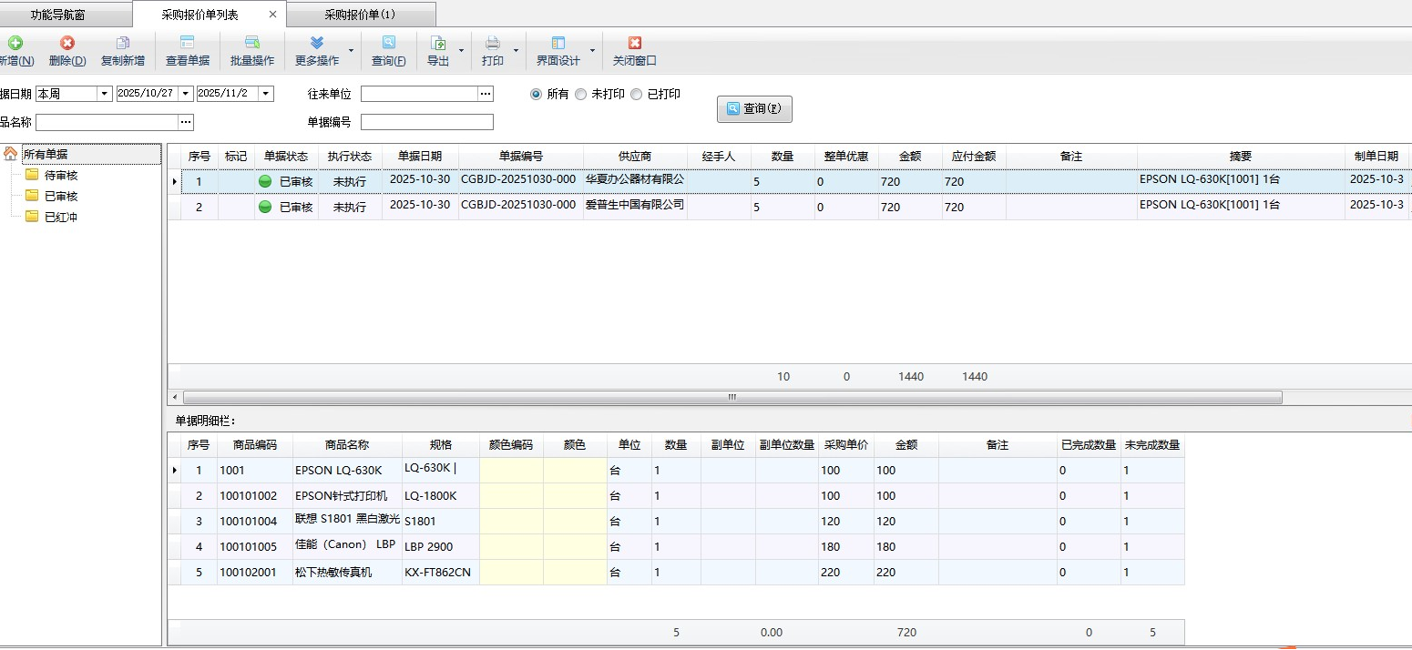 ????在功能導航窗點“采購管理”—》“采購報價單”即可進入“采購報價單列表”界面,如下圖所示: