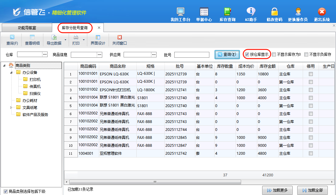 ????倉庫管理相關查詢統計中可查看商品的庫存數量,批號商品庫存數量可在“庫存分批號查詢”和“庫存查詢”中查看。
