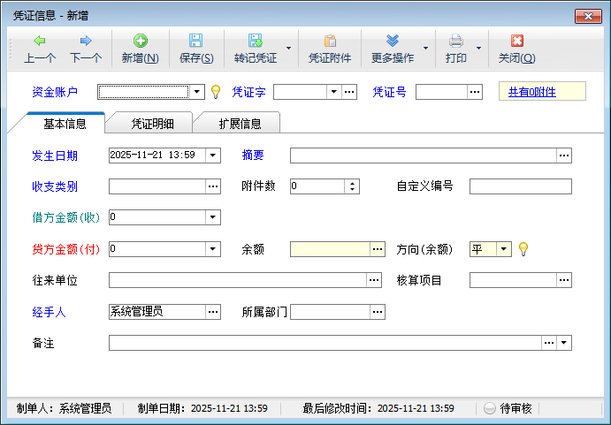 發生日期:必填項,默認為當前機器的時間。需要特別注意的是,發生日期會影響日記帳帳簿的顯示,即次序問題,如果當天一筆本應先“借”(收入)的憑證后錄入,就有可能會導致當天的余額為負數。當然,這不會影響帳戶的余額。