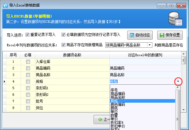????導入選項可設置重復記錄是否導入(根據商品名稱判斷)、必填項為空的記錄是否導入、以及商品不存在是否新增商品、根據什么條件判斷商品是否已存在。