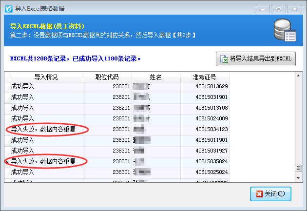 ????導(dǎo)入過程中軟件會(huì)實(shí)時(shí)顯示導(dǎo)入進(jìn)度,如果數(shù)據(jù)量比較大時(shí),導(dǎo)入進(jìn)度達(dá)到100%時(shí)軟件進(jìn)行數(shù)據(jù)提交會(huì)比較耗時(shí)。導(dǎo)入結(jié)束后,軟件會(huì)顯示導(dǎo)入的結(jié)果。沒有導(dǎo)入的記錄軟件會(huì)給出相應(yīng)的原因,如下圖所示: