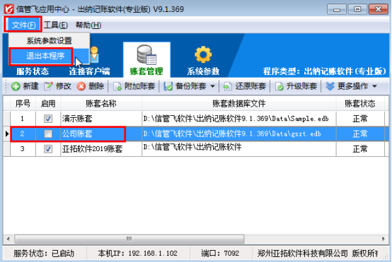 ????亞拓軟件旗下的信管飛RMS、信管飛倉庫管理軟件、信管飛送貨單軟件、信管飛出納記賬軟件、信管飛票據打印軟件等軟件程序安裝后會顯示兩個圖標,一個是應用中心程序(紅色圖標),一個是客戶端程序(藍色圖標)。這些軟件都含有賬套管理功能,在應用中心里面可以建立多個賬套,已使用的帳套如果不再繼續使用,可以停用帳套,停用帳套后,客戶端程序登錄時無法連接該帳套。我們以信管飛出納記賬軟件專業版為例演示一下如何停用帳套。