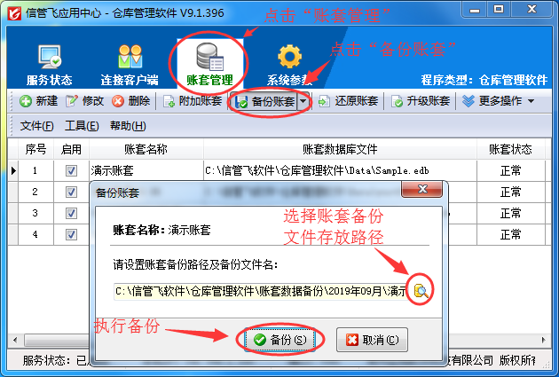 ????一、在信管飛倉庫管理軟件應用中心程序中執行賬套備份。