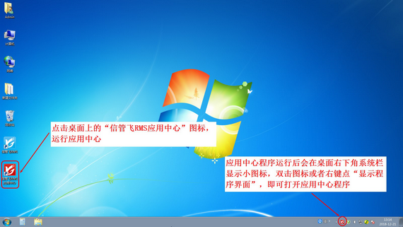 ????運行信管飛RMS應用中心并打開信管飛應用中心程序界面,主機電腦上軟件安裝后會在桌面上自動創建“信管飛RMS應用中心(紅色圖標)”及“信管飛RMS即客戶端(藍色圖標)”的快捷方式,點擊“信管飛RMS應用中心(紅色圖標)”即可運行信管飛RMS,如下圖所示。