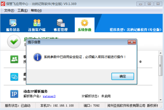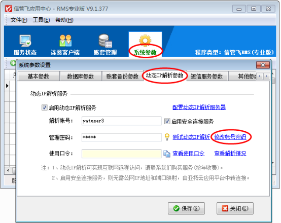 ????動態IP解析服務是亞拓軟件開發的基于互聯網的遠程連接解決方案,采用專屬安全技術,可以支持網絡版本在異地連接主機電腦進行共享數據使用。動態IP解析服務屬于增值服務,使用需要另外進行購買,購買后會分配解析賬號、管理密碼和使用口令信息,管理密碼和使用口令可以自己修改。下面我們以信管飛RMS為例介紹一下如何修改動態IP解析服務的管理密碼及使用口令。