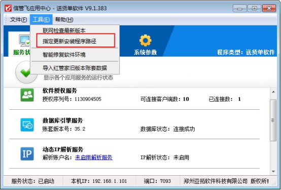 ????信管飛送貨單軟件、信管飛RMS軟件、信管飛倉庫管理軟件等都支持網絡版本(即可以多臺機器同時使用,數據共享,數據集中存儲在一臺機器上),軟件會不定期更新新版本,網絡版多臺電腦使用的時候,每次更新程序需要每臺電腦都下載最新版安裝程序進行安裝,非常麻煩。軟件支持在主機電腦的應用中心程序上指定更新安裝程序,便于客戶端登錄的時候如版本不一致會提示直接下載安裝程序。