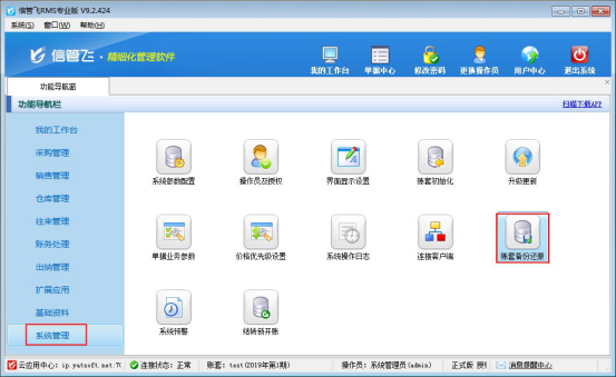 ???? 新增賬套登錄后,信管飛RMS軟件新增賬套是未啟用狀態,先在“基礎資料”—“期初建賬”中啟用下賬套,啟用后在功能導航窗點擊“系統管理”—》“賬套備份還原”,進入賬套備份還原界面。如下圖所示:
