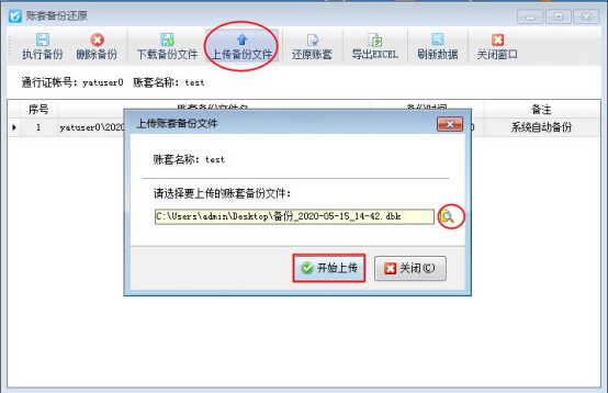???? 在賬套備份還原界面,點擊“上傳備份文件”,可選擇本地的備份文件(.dbk格式),進行上傳,如下圖所示: