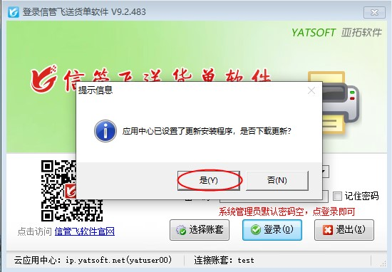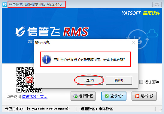 ????以上圖為例,當前客戶端版本號是V9.2.440,云應用中心版本號是V9.2.463,提示信息窗口點擊“確定”按鈕,系統提示“應用中心已設置了更新安裝程序,是否下載更新?”,點擊“是”,如下圖所示: