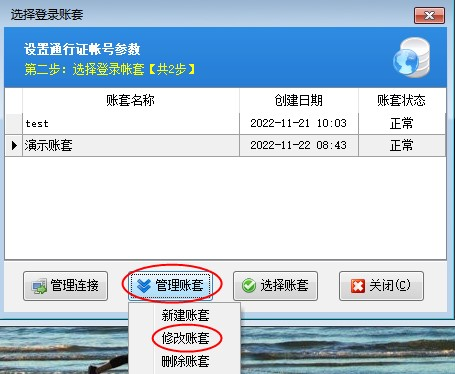 ????輸入通行證賬號和密碼后,點擊下一步會進入選擇登錄賬套界面,新賬號登錄需要新增賬套,在“管理賬套”中點擊新建賬套,輸入賬套名稱新建,完成后選擇賬套登錄軟件即可,如下圖所示: