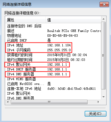 ????②本地連接狀態(tài)如圖所示,點擊“詳細信息”按鈕,會出現(xiàn)如圖所示的網(wǎng)絡連接詳細信息,此時需要記一下“IPv4地址”、“IPv4子網(wǎng)掩碼”、“IPv4默認網(wǎng)關”和“IPv4 DNS服務器”的信息,后面固定IP地址時需要用到。