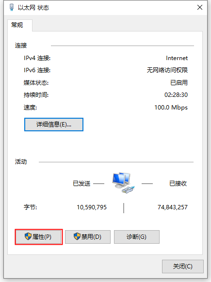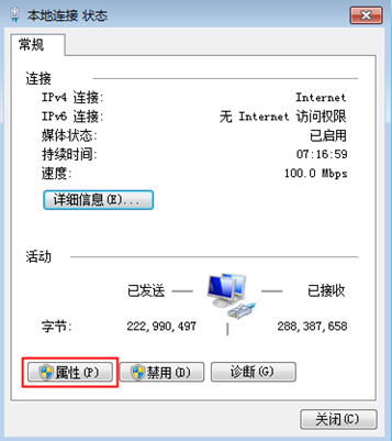 ????③把“網(wǎng)絡連接詳細信息”的界面關閉,回到“本地連接狀態(tài)”的界面,如圖所示,點擊“屬性”按鈕,會出現(xiàn)“本地連接屬性”的界面,如圖所示。