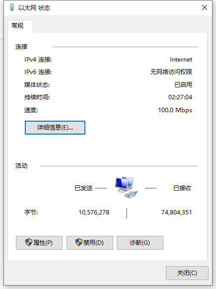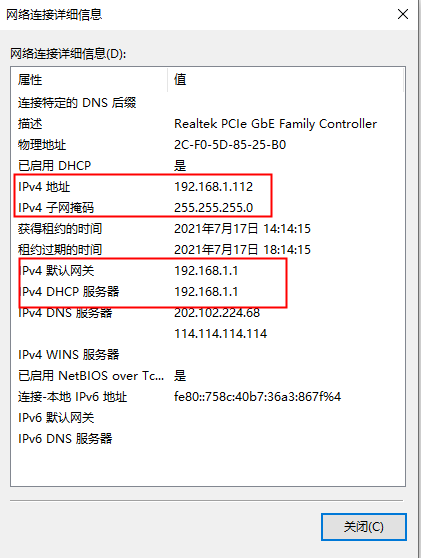 ????②以太網(wǎng)狀態(tài)如圖所示,點擊“詳細信息”按鈕,會出現(xiàn)如圖所示的網(wǎng)絡連接詳細信息,此時需要記一下“IPv4地址”、“IPv4子網(wǎng)掩碼”、“IPv4默認網(wǎng)關”和“IPv4 DNS服務器”的信息,后面固定IP地址時需要用到。