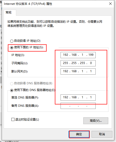 ????注意:此時的IP地址是可以自己設置的,為了避免IP地址沖突,建議在給主機電腦固定IP地址時把IP地址設置的大一些,可改為“192.168.1.199”,子網(wǎng)掩碼、默認網(wǎng)關和DNS服務器信息則不能修改。