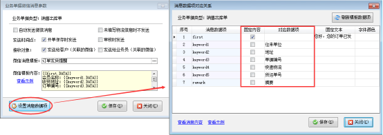 ????模板消息添加完成后,需要設置微信模板消息和軟件數(shù)據(jù)項的對應。如下圖所示:
