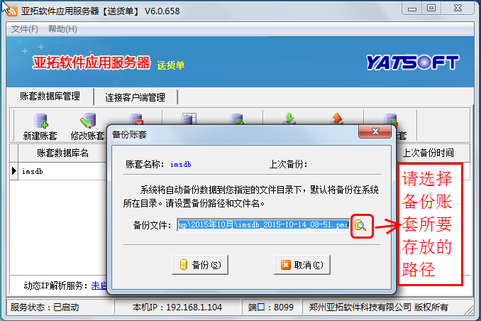 ????先在原主機上登錄軟件檢查下數(shù)據(jù),確認沒問題后,打開亞拓軟件應用服務器,在亞拓軟件應用服務器上選中賬套,點擊“備份賬套”執(zhí)行備份賬套操作,點擊備份賬套后,會彈出“備份賬套”窗口,可以選擇備份文件所存放的路徑(一般情況下默認存放在軟件的安裝目錄下DBBackup文件夾下),然后將剛才備份的賬套數(shù)據(jù)文件通過U盤或者移動硬盤等方式拷貝到新主機電腦上。