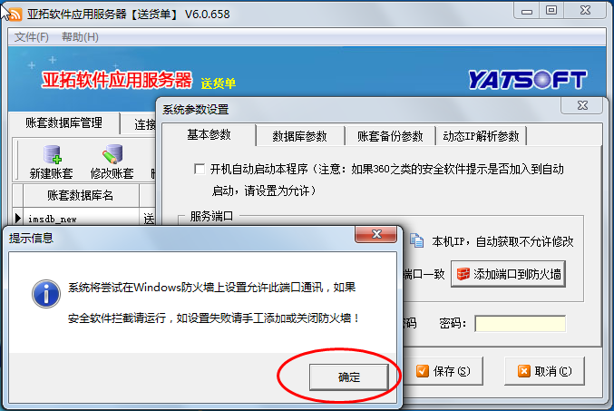 ????主機沒問題后,客戶端電腦有時可能無法連接主機,登錄失敗,此時請固定主機IP地址,另:打開亞拓軟件應用服務器,點“文件”——》“系統(tǒng)參數(shù)設置”——》“基本參數(shù)”——》“添加端口到防火墻”。(為什么需固定主機IP地址及如何固定IP地址請參見這篇文章:網(wǎng)絡版軟件固定主機IP地址的方法)
