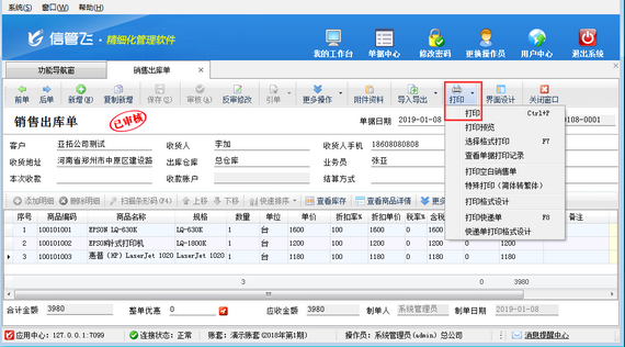 ????設置完成后,操作員登錄軟件打印單據(jù)時即可選擇使用云打印機進行打印單據(jù)。點擊“銷售管理”->“銷售出庫單”,新增一個銷售出庫單并打印,打印時可選擇使用云打印機或者本地打印機進行打印,如下圖四、圖五、圖六所示。