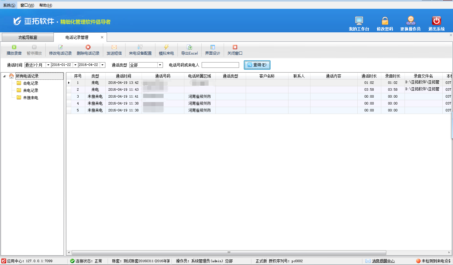 ????在電話記錄管理界面選擇通話時間,輸入來電號碼或者來電人信息查詢即可查詢到我們所需要的來電信息,選擇所需要的來電信息,點擊“播放錄音”按鈕即可播放當前來電的通話自動錄音。