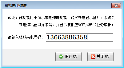 ????模擬來電:此功能可以實際模擬演示來電彈屏功能,在模擬來電彈屏窗口輸入模擬來電號碼,點擊“保存”后系統(tǒng)會自動彈出來電彈屏窗口,如下圖所示: