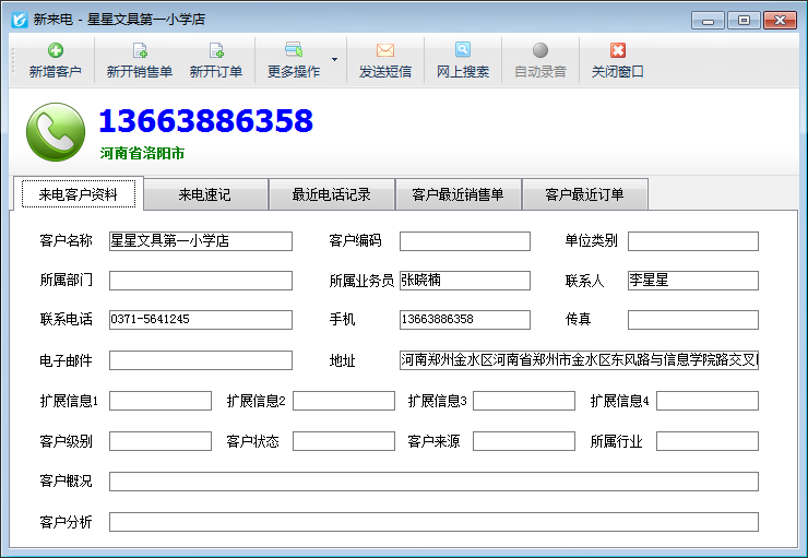 ????來電彈屏:客戶來電時,來電彈屏窗口會自動顯示出在“基礎資料”——》“客戶資料”內(nèi)維護好的此客戶的相關信息、客戶最近電話記錄、客戶最近銷售單及客戶最近訂單,使得您可以在通話之前可以全面了解客戶信息。