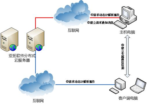 ????①主機電腦向亞拓軟件云服務器發(fā)送動態(tài)IP解析服務請求。