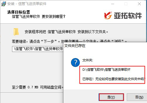 ????刪除后邊重復的內(nèi)容,點擊下一步,會提示文件夾中已存在軟件,是否繼續(xù)安裝在此文件夾,點擊“是”表示覆蓋安裝到之前的文件夾中。如下圖所示: