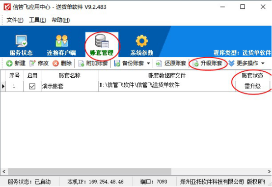 ????軟件安裝完成后,運行應用中心和客戶端程序,在應用中心界面,選擇賬套管理,顯示之前的所有賬套信息,賬套狀態(tài)為“需升級”,在賬套管理界面點擊升級下賬套,升級賬套不影響數(shù)據(jù)!(也可登錄時直接升級),如下圖所示: