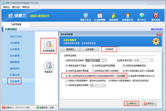 ????在功能導航窗點擊“系統(tǒng)管理”—》“系統(tǒng)參數(shù)配置”,在“出納參數(shù)”界面勾選“錄入出納憑證時發(fā)生日期的年份與系統(tǒng)日期的年度不一樣時提醒”參數(shù),然后點擊“保存”按鈕保存參數(shù)配置。