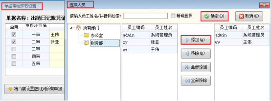 ????在功能導(dǎo)航窗,點(diǎn)擊“系統(tǒng)管理”—》“系統(tǒng)參數(shù)配置”—》“出納參數(shù)”中勾選啟用“出納憑證啟用多級審核”,點(diǎn)擊右邊文本框的“...”處,進(jìn)入單據(jù)審核環(huán)節(jié)設(shè)置,如下圖所示,對出納日記賬憑證進(jìn)行了二級審核的設(shè)置,一審操作員是“王偉”,二審操作員是“張亞”。