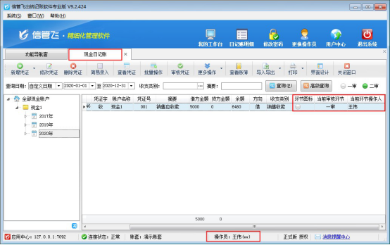 ????操作員“王偉”登錄軟件,新增一個(gè)現(xiàn)金日記賬,審核日記賬后,在日記賬列表界面,在界面設(shè)計(jì)中勾選顯示出“當(dāng)前審核環(huán)節(jié)”,可看到顯示為一審。如下圖所示: