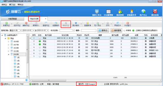????信管飛出納記賬軟件標(biāo)準(zhǔn)版和專業(yè)版在新增保存日記賬憑證后都可以直接審核憑證,憑證審核后,不允許直接刪除。客戶如果需要?jiǎng)h除已審核的憑證,需要先反審憑證,再進(jìn)行刪除。下面我們介紹一下在信管飛出納記賬軟件專業(yè)版中如何刪除已審核的日記賬憑證?