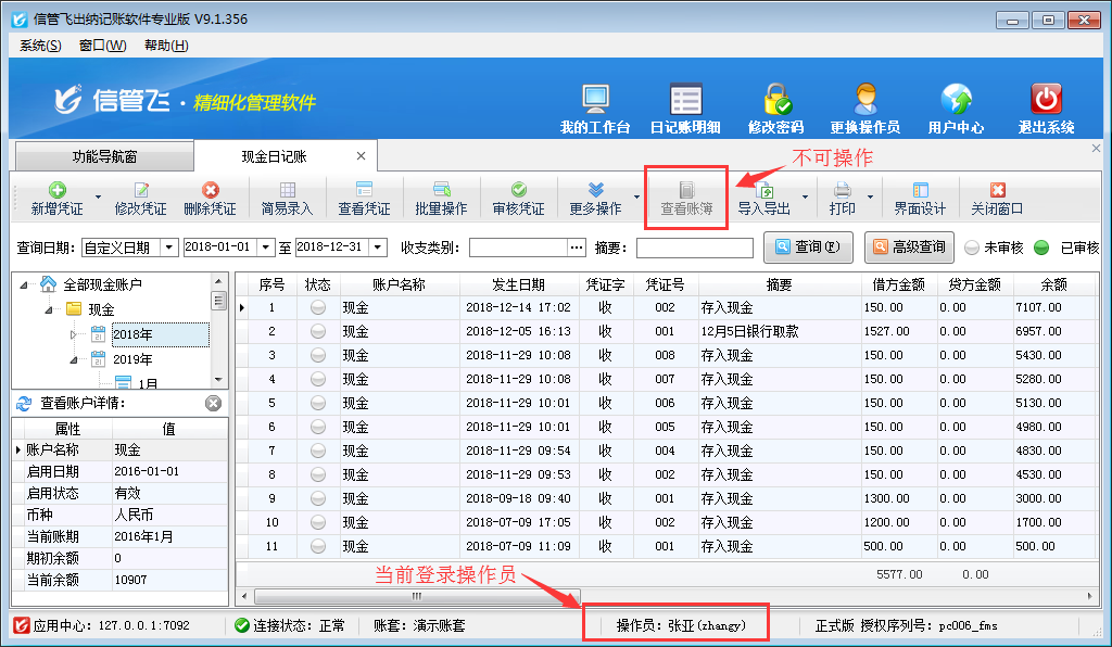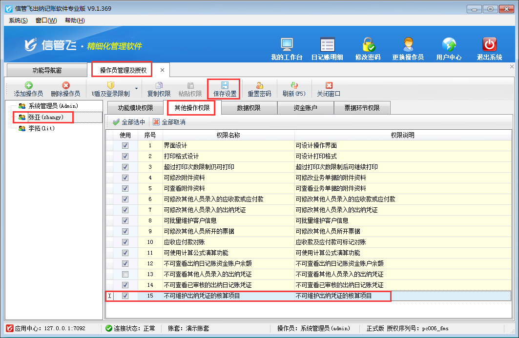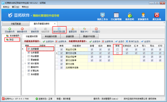 ????信管飛出納記賬軟件、信管飛RMS(標(biāo)準(zhǔn)版、專業(yè)版)都有出納模塊,可以管理現(xiàn)金日記賬和銀行日記賬。許多用戶在出納管理有審核出納憑證人員,軟件支持設(shè)置操作員的日記賬憑證的審核權(quán)限。以信管飛出納記賬軟件專業(yè)版本為例,介紹一下如何設(shè)置操作員不可審核現(xiàn)金日記賬、銀行日記賬的方法。